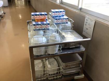 今日のメニューはツイストパン、ハンバーグ、サラダ、ポークビーンズ、牛乳です。今年度から市内のこども園の園児、小中学生は給食無償になります。教員は無償にはなりませんが、温かく栄養が考えられた給食をいただけるのはありがたいことですね。4時間目の途中に、配膳員さんが教室の近くまで給食カートを運んでくださいます。