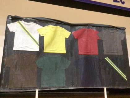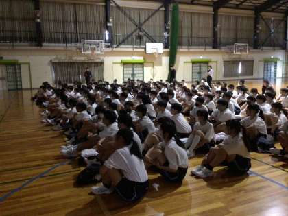 始めは体育館でお話を聞きました。一番上の写真は色が異なる8枚のTシャツです。体育館を真っ暗にしてそれぞれの色が夜暗い中でどのように見えるか試していました。白や黄色以外の色(黒、緑、紺色、茶色、赤など)はびっくりするほど見えません。車の運転手から存在が意識してもらえるような色を着ることが自分の安全を守るために大切なことだと生徒たちは改めて感じている様子でした。