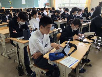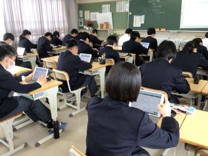 今日は学力テストの方ではない調査(児童生徒の意識調査のようなもの)を行いました。以前は紙で記入していたものを現在はタブレットで行います。調査項目がたくさんあります。写真はその様子です。