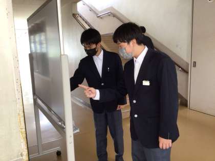 ちょうど2年生の学年ホワイトボードのところに生徒が確認に来ていましたのでタブレットで撮りました。2人で一生懸命に連絡事項を確認していました。重要業務、お疲れさま!
