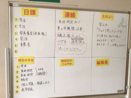 各学年のフロアには学年ホワイトボードがあり、学年主任からのメッセージや諸連絡、明日の活動内容等が書かれています。各学級の係(書記が主にその係になると思います)が毎日それを確認し、教室の背面黒板等に記入してクラスに伝えます。