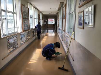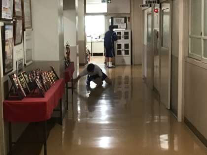 今日から通常清掃が始まります。写真の3枚目、床をとても丁寧に拭く素敵な姿を見つけました。拭いた後の床は美しく光っていました。とても立派です。