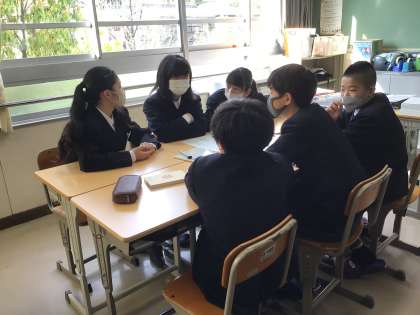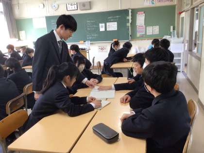 上の写真は1年2組です。目標を班で話し合っている様子です。担任の先生が生徒たちにアドバイスをしていました。