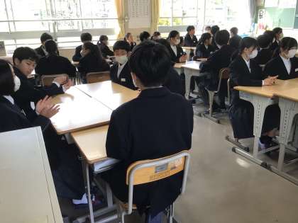 一番下の写真は1年1組です。机を班の形にして名前や好きな食べ物などを話して自己紹介をしていました。まだ、なんとなくぎこちなさが伝わってくる生徒たち(なんといっても知り合って数日しか経っていないですからね)まずは周りの子と話したり、ちょっとしたことを一緒にやることですね。すぐに打ち解けて仲良くなれます。協力して学校生活を送っていきましょう。