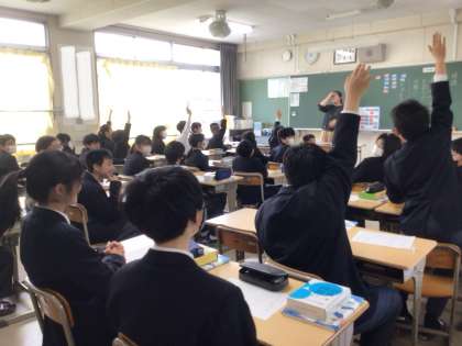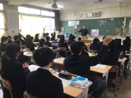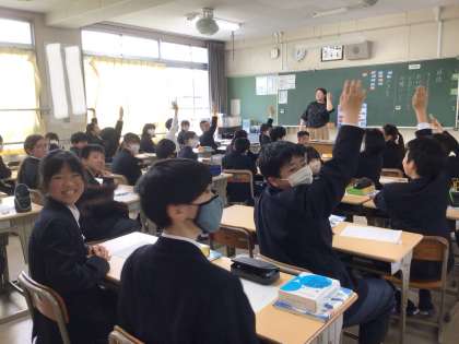 写真は1年2組の国語の様子です。先生と生徒たちが楽しそうな雰囲気でやり取りをしながら「国語の授業で大切にしたいこと」や約束事などについて確認をしていました。さっそく手の挙げ方が素晴らしいですね!