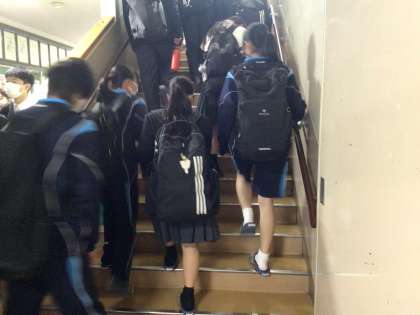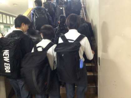 おはようございます。8時5分の登校風景です。ジャージ、ブレザー、スカート、スラックス、上着なしの長袖、半袖体操服、半袖ポロシャツ、ハーフパンツ、色々な服装で生徒が登校してきました。全部OKです。