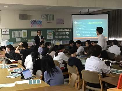 先生たちはスカイメニューの色々な機能を使いながら、実際の授業や評価の場面でどのような活用ができるか具体的に学びました。講師として来てくださった飯野小学校長の大村先生からは、協働的な学びをどうとらえて、どういう状態になれば協働的な学びになっているかについて深いご示唆をいただきました。先生の実践に基づく具体的なお話を通じて、授業に役立てられることをたくさん教えていただきました。