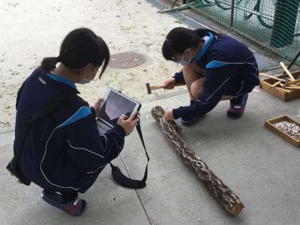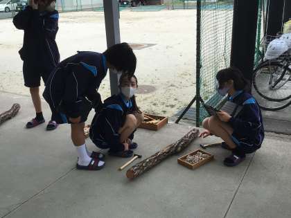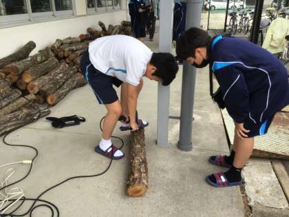 ドリルで穴を開けて、しいたけの菌駒を穴に埋めていきます。トンカチでトントン。貴重な体験ですね。作業の様子をタブレットで記録します。1年2組の様子です。先生が山から原木をたくさん持ってきてくれました。
