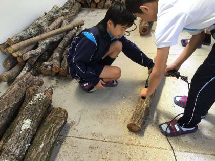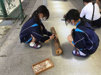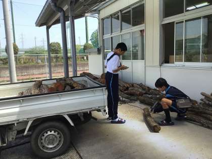 4時間目、1年5組の技術の授業の様子です。昨日と同じ、このクラスも椎茸の菌打ちを行っています。しいたけ栽培に適した木は落葉する広葉樹だそうです。写真に写っている軽トラは先生のもの。大量の原木を山から運んできてくれました。