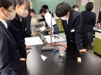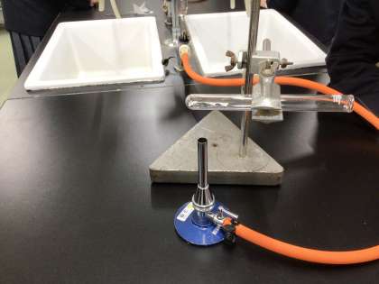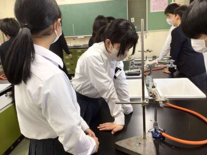 4時間目の理科室です。2年生がさっそく実験をしていました。試験管に入れた酸化銀をバーナーで熱しています。どうなるでしょうか。観察中です。
