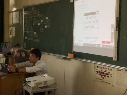 3年3組の数学です。先生がICTカートのプロジェクターにタブレットをつないで答え合わせに活用していました。3年2組や3年4組の英語の授業でもICT機器の活用が見られました(写真がありませんが)