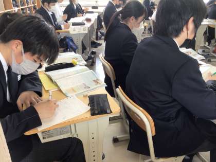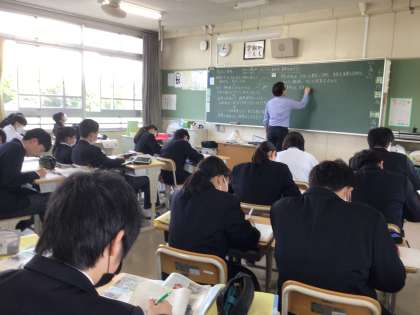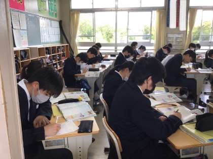 3年6組の社会科の授業です。20世紀初めのロシアに起きた政治的な動きについて学んでいました。真剣な目で説明を聞き、熱心にノートをとる生徒たちの姿がありました。