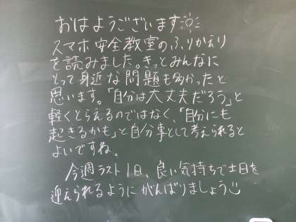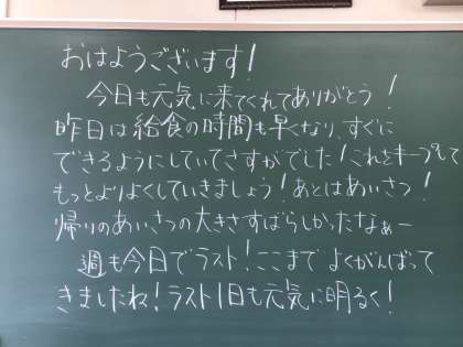 おはようございます。風があって爽やかな朝です。半袖の子には少し肌寒いかなと感じながら、登校してくる生徒を迎えました。学校で友達に会うと、話したいことがたくさんあるんですね。笑顔で話しながら教室に向かう生徒の姿をたくさん見ました。