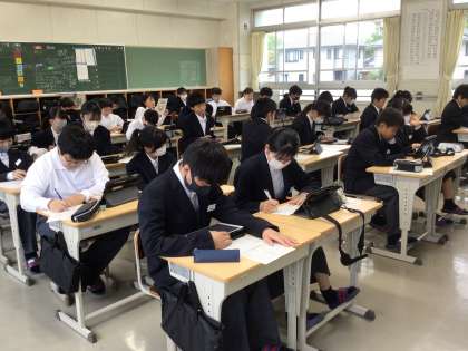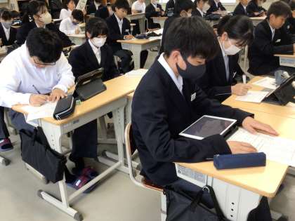 1年生教室の様子です。タブレットでデータ配信された生徒総会要項を見ながら質問事項を書いています。1年生にとっては生徒会自体が初めてのことです。1年生のある生徒から「級長や書記への質問はどうしたらいいですか?」と質問が出ました。1年生教室に説明に来ていた生徒会長が生徒会の組織について一生懸命に説明していました。