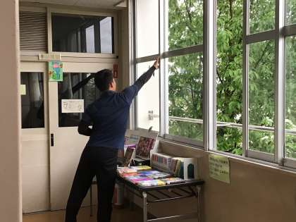 おはようございます。生徒登校前の一枚です。朝、廊下にツバメが迷い込んでいました。通りかかった先生がツバメを外に出してあげようと、優しく語り掛けながら外に誘導していました。「こっちだよ、そっちじゃないよ」「よしよし」写真はタブレットで撮った鳥と先生の2ショットです。先生の優しさで、ツバメは無事に外に飛び立って行きました。ツバメの恩返しがあるかもしれませんね。