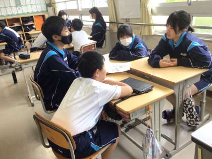 今日は今年度2回目のSSTです。生徒たちは1回目に比べて打ち解けた様子で、互いが話す声も大きくなっていました。廊下まで元気な声が響いてきました。写真は1年生の様子です。身を乗り出すようにして相手の話を聞く姿がいいですね。