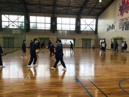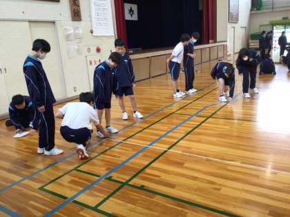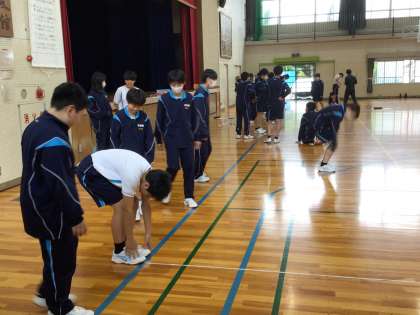 4時間目の2年3組と4組の体育の授業です。外は雨です。体育館の中では体力テストを行っていました。立ち幅跳びは記録の測定でしょうか。そしてハンドボール投げは外で記録を測る時に備えての練習でしょうか。生徒たちは張り切って活動していました。