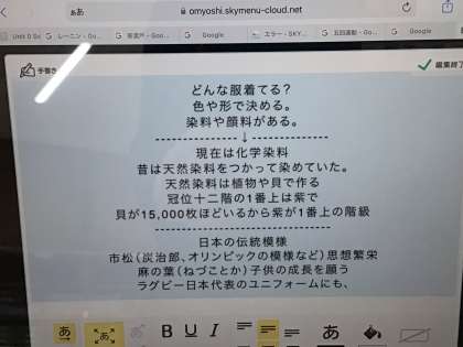 3年2組の美術です。和の文様は何とも言えない美しさがあります。ねずこ(麻の葉模様)善逸(うろこ紋)うろこだきさん(青海波)。アニメで見慣れた文様もありますね!それぞれの文様には意味があるそうです。先生の説明を生徒たちはタブレットでメモしていました。使いこなしています。