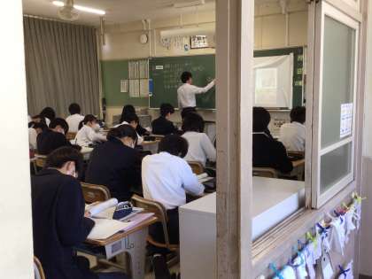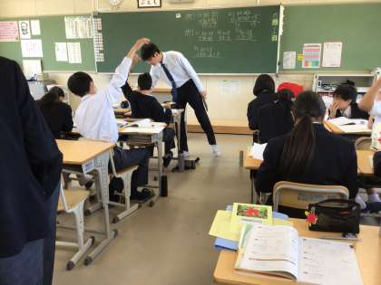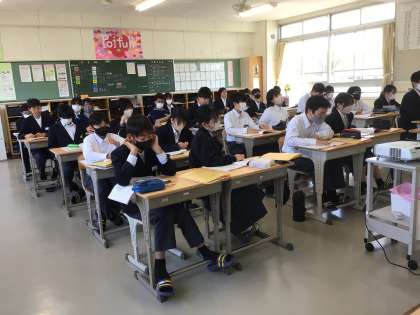 4時間目後半の授業の様子です。写真の上から、2年1組の数学、2年6組の社会、2年7組の英語です。2年1組の数学では、生徒たちが教え合いをしている場面をみました。お腹がすいたと思いますが2年生は授業をがんばっています。給食までもうひとがんばりですよ。