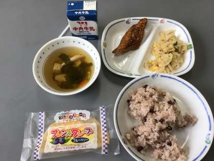 今日の給食は赤飯です。入学おめでとう&進級おめでとうのメニューですね。ブルーベリージャムとホイップクリームの入ったクレープもついています。デザートがついていると嬉しいですね。午後の授業も頑張りましょう。