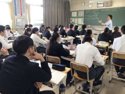 4時間目の3年生社会科の授業です。連休の狭間の平日ですが、生徒たちは落ち着いて学習に取り組んでいます。円安、株価など、社会情勢と経済の仕組みは現代に通じる内容です。先生の説明をしっかりと聞き、ノートに書いている生徒の姿がありました。