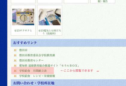 今まで毎月配付されていた給食献立表がデータ化されています。以下のように見ることができます。