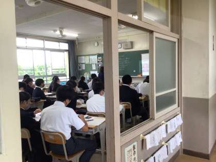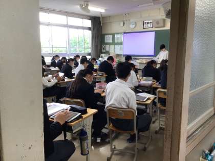 写真は上から3年4組の道徳、3年2組の国語、3年1組の社会です。社会科では今、1930年代の日本について学習しています。戦争に向かって様々な出来事が起こった時代です。生徒は熱心にノートをとっていました。