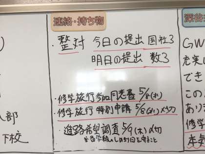 修学旅行関係、進路希望調査。明日あさってが期限の大切なものがありますよ。お家の方ともしっかり相談してくださいね。