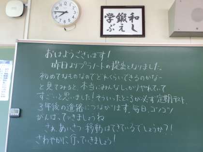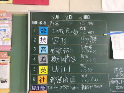 写真は1年生教室です。あれ?今日は校歌のテストがあるようです。歌詞は覚えましたか?頑張って歌いましょう!