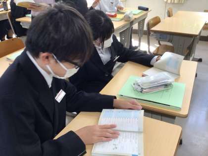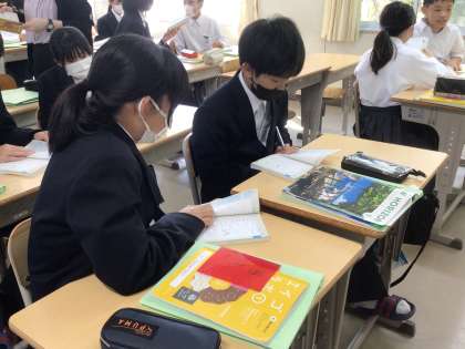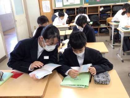 1時間目、1年5組の英語の様子です。単語や熟語の意味などを隣同士で問題を出し合いながら確認しています。覚えることがどんどん増えていきますね。確実に積み重ねていきましょう。
