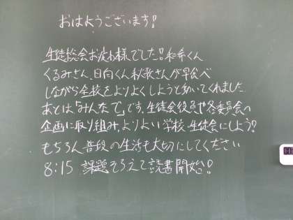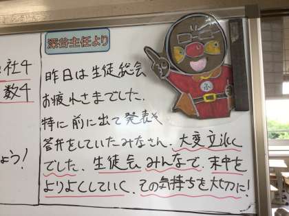 写真は3年生フロアの様子です。昨日の生徒総会で活躍した皆さん、お疲れ様でした。決議された内容を具現化していってくださいね。