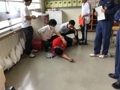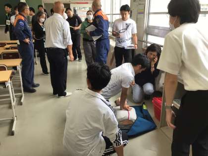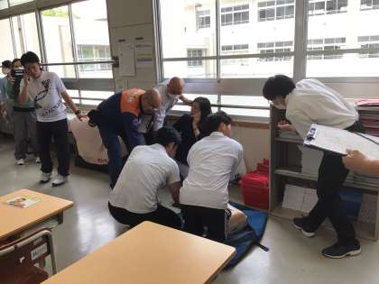 今日は生徒の下校後、全職員でシミュレーション訓練を行いました。消防署から講師の方たちに来ていただいて実践的な訓練を行います。学校では毎年、こうした職員を対象にした救命救急講習やシミュレーション訓練を行っています。