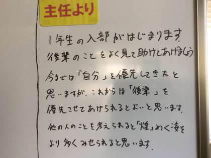 2年生フロアの様子です。学年主任の言葉に書かれているとおり、昨年度と違って皆さんは部活動でも先輩という立場になりますね。41回生の「煌めく姿」を期待しています。職場体験学習に向けて様々な準備も進んでいます。