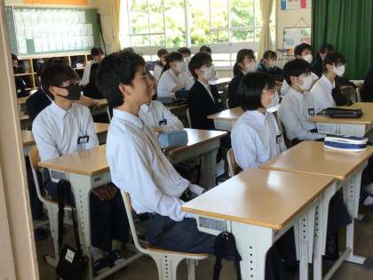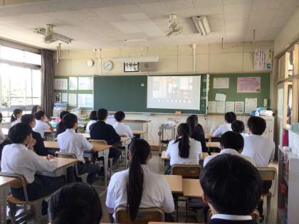 3年生の5、6時間目は総合的な学習の時間です。5時間目の始めは進路指導室と各教室をタブレットで繋いでミニオンライン学年集会を行っていました。内容は学年主任の話、修学旅行担当者の話、進路指導主事の話です。