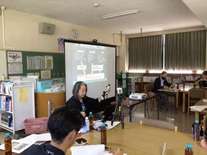 今回の熱中症予防研修では、子ども達を取り巻く現状(昔とは違う気候、生徒の生活スタイルの変化、学校生活における対応等)をお話しながら、生徒に指導する場面で熱中症のリスクは常にあることをお伝えしました。プレゼンを用いて養護教諭から熱中症の症状や対応について話をし、WBGT計測器や経口補水液、塩分タブレット等を紹介し、体育館に冷蔵庫を設置し経口補水液等が入れてあることなども説明しました。指導員の先生方は熱心にメモを取りながらお話を聞いてくださっていました。