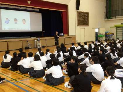 3時間目に講師をお招きして2年生を対象にマナー講座を行いました。教えてくださったのは多くの企業、自治体、高校、中学校など様々なところでマナー講座を行ってみえる方です。大変エネルギッシュ&具体的に、職場で求められる姿やマナー、大切にすべきことなどについて教えていただきました。