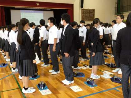 写真はあいさつの仕方を練習している生徒の様子です。