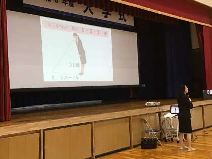 3時間目、体育館での2年生マナー講座の様子です。