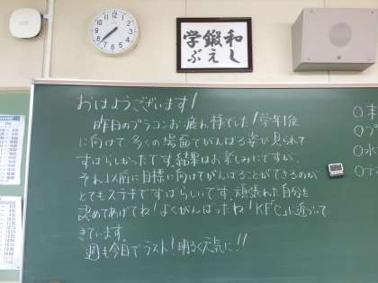 今日は6時間目に1年生が総合的な学習の時間として外から講師をお招きしてSDGsについて学びます。また、2年生は職場体験学習の事前打ち合わせに出かけます。気をつけて行ってきてくださいね。今日1日、頑張りましょう!