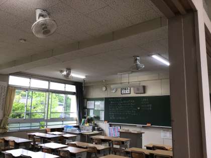 おはようございます。朝の教室の様子です。暑くなってきました。窓が開けられていて電気が点いています。天井に備え付けられた扇風機が回っています。生徒が登校してきた時に涼しく過ごせるようにと担任の先生が準備をしてくれていました。