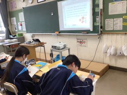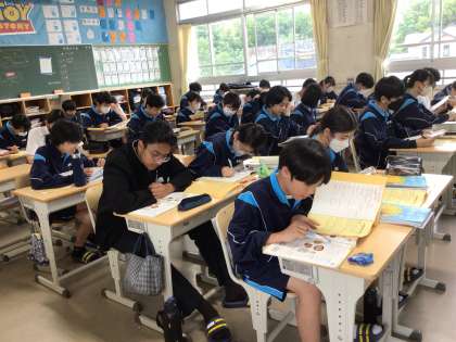 2年2組の英語の様子です。生徒たちが熱心に英文を声に出して練習していました。英文を暗誦しているところでした。先生に聞いてもらって上手に暗誦できたらシールがもらえるようです。