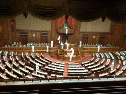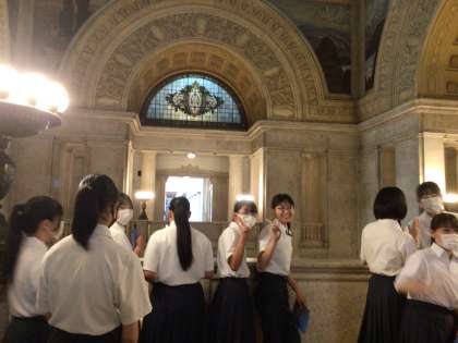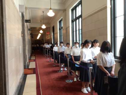 国会議事堂の中です。重厚感がある建物を見ながら絨毯の上を歩いている生徒たちです。本会議場も見ることができました。