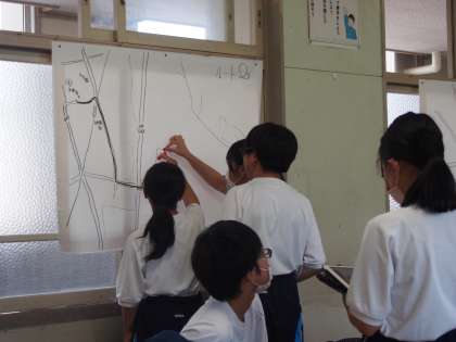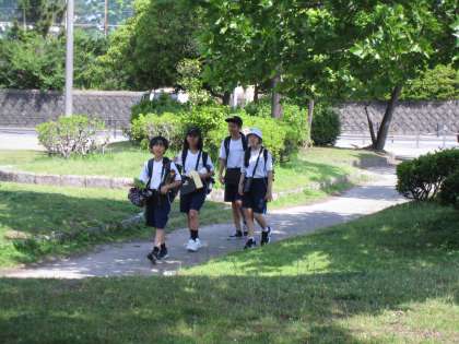 総合的な学習の時間に地域にあるSDGsと関係のあるものを見つける活動をしています。これまでの授業では、タブレットの地図機能を使い、地域にある施設や場所、そこへの行き方を調べていました。今回は学校を飛び出し、調べたことをもとに実際に場所や施設を見に行きました。各チェックポイントでは、学年の教員がSDGsに関係のあるクイズを出題し、それに答えることで、楽しみながらより理解を深める様子が見られました。