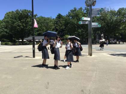 暑いですね。今日は東京も今年初の猛暑日との予報です。傘をさして上野から舞浜に移動して行く班の子たちに会いました。昼食もしっかり食べたようです。お茶もしっかり飲んでね。