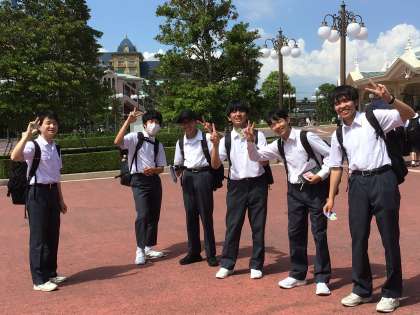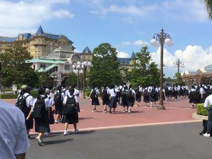 生徒が続々とディズニーランドに集まってきています。健康状態などに異常がないことを報告して、先生からチケットとミールクーポンを受け取った班から入場します。笑顔で入場ゲートに向かって行く生徒たちです。