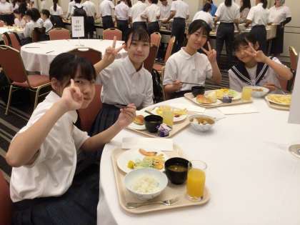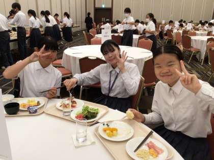 ホテルで食べる最後の朝食です。今朝は先生たちに起こされて目が覚めた班もあったようです。爆睡していたようです。昨日は動き回ったので疲れたんでしょうね。朝食の食べっぷりは元気いっぱいです。
