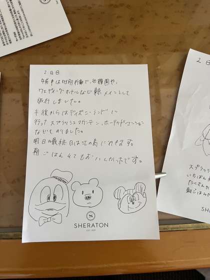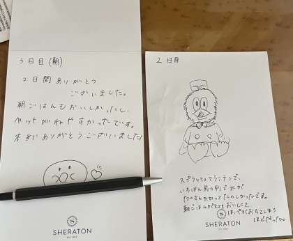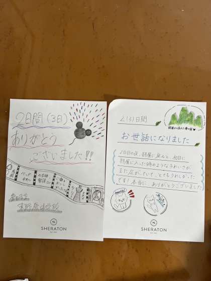 ホテルの皆さんへの手紙を書いて部屋においた生徒たちがいました。「2日目の夜、戻った時に初日のように部屋がきれいでとても嬉しかったです」「ごはんがとてもおいしくて、ほっぺが落ちそうでした」「お世話になりました」という言葉が並んでいます。すてきですね。