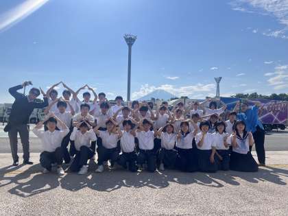 写真は5組です。バックに富士山が見えますね。掛け声は「富士〜」でしょうか。みんなで仲良く「お山ポーズ」です。午前中の東京は良い具合に曇っていましたが、西に向かってバスを走らせるうちに青空が広がり暑くなってきました。豊田も暑いことでしょう。
