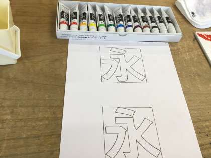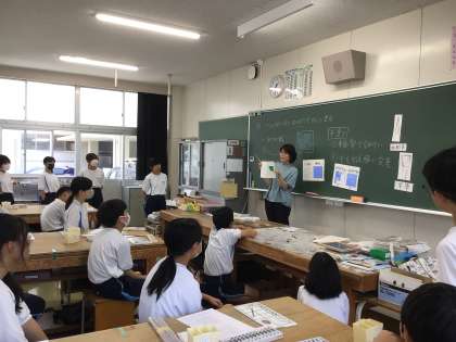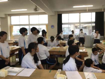 1年3組の美術の様子です。水彩絵の具で色をムラなく塗る方法を先生が実演していました。細い筆の使い方、平筆の使い方の説明をしながら先生が実際に塗っている様子を、生徒たちが熱心に観察していました。この後、生徒たちもやってみるようです。うまくできるかな。