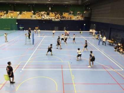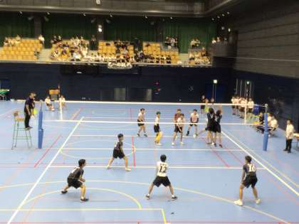 写真は三好運動公園の男子バレー部の様子です。試合は2セット目に入っていました。リードしていました。奥の白いユニフォームが末中です。